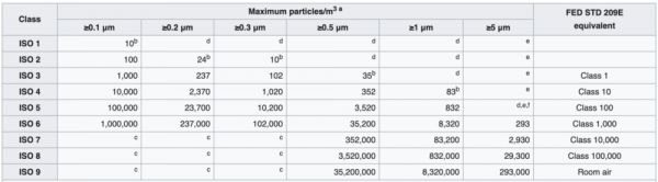 不同级别的CleanRoom标准。来源:维基百科