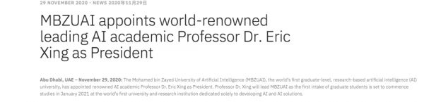 世界上第一所研究型人工智能大学穆罕默德·本·扎耶德人工智能大学(Mohamed bin Zayed University of Artificial Intelligence,简称「MBZUAI」)任命著名华人学者邢波为校长。