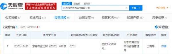 天眼查App显示,近日,ofo小黄车的关联公司北京拜克洛克科技有限公司新增1条行政处罚信息,决定文书号为京海市监工罚(2020)486号,决定机关为北京市海淀区市场监督管理局,处罚结果为罚款150000元。