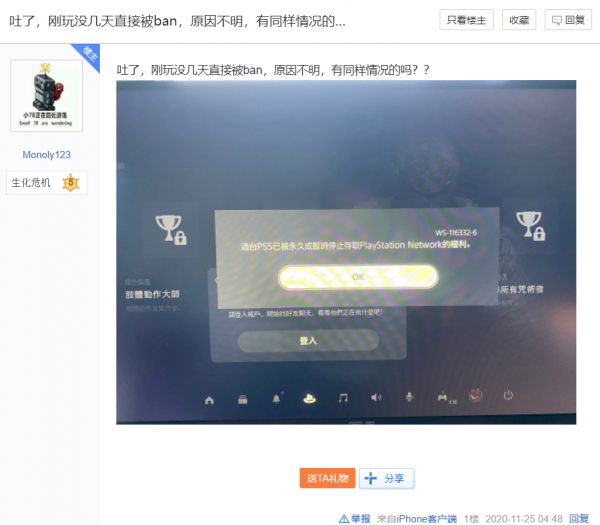 就在PS5正式发售两周之际,在PS5贴吧有人发帖称自己的机器因不明原因被Ban机,该机器将永久或暂时无法联网。而这在当时很可能是全球首例公开的PS5被Ban机案例。