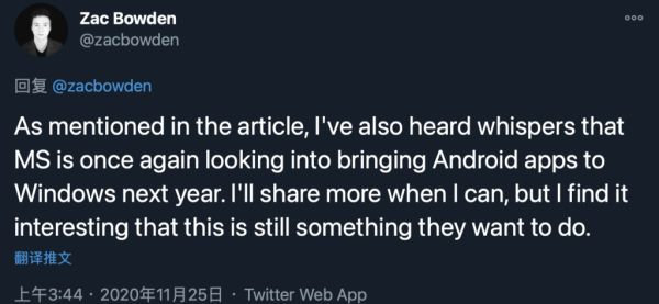 11 月 25 日,Twitter 用户 Zac Bowden 抖出了一个大爆料——微软明年或许会让原生 Android 应用在 Windows 上跑起来。