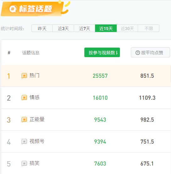 据新视数据,近15天内,参与视频数最多的话题为#热门#、#情感#和#正能量#,其中,有超过2.5万条视频都带了#热门#这个话题。