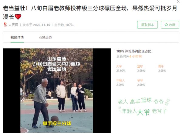 比如,“人民网”介绍了一位八旬白眉老教师,在球场上投出一记神级三分球碾压全场,并配文“果然热爱可低岁月漫长”。视频发布5天后达到10万+点赞,不少网友评论“高手”“好帅”。