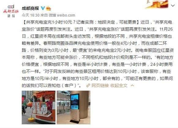 据成都商报报道称,街电方面称共享充电宝“有些地方是10元/半小时,有些地方10元/小时,可能还有更贵的”。