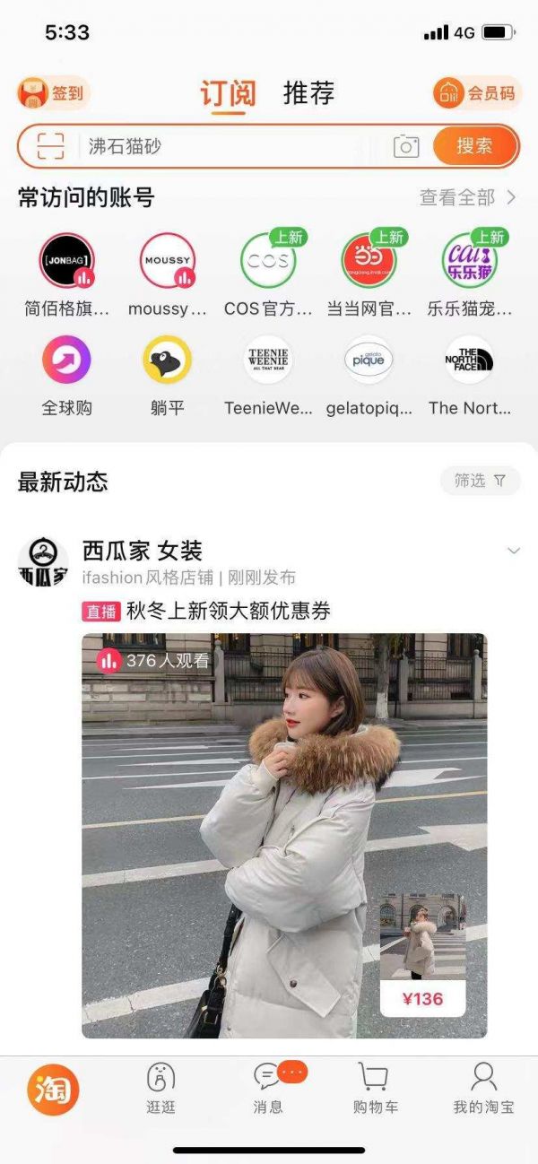 1、“微淘”改名为订阅,在首页上方新增了一个tab,与“推荐”并列;