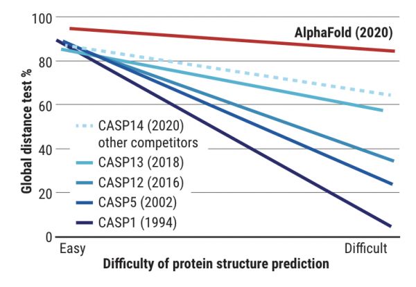 在两年一次的 CASP 竞赛中,各组争先预测蛋白质的 3D 结构。今年,AlphaFold 击败了所有其他小组,并在准确性方面与实验结果相匹配。