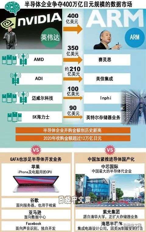 英伟达9月发布了将从软银集团手中收购ARM的消息。收购采用现金和换股两种方式,最高将达到400亿美元。通过这笔交易,在可以快速运算AI大量数据的GPU(图形处理器)方面具有优势的英伟达获得了承担AI指挥中心的CPU(中央处理器)技术。黄仁勋表示“新一代互联网将变得更为庞大,我们将实现新一代AI”。