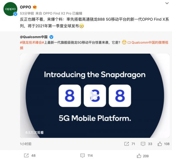 国产厂商 OPPO、vivo 们也很快官方宣布搭载骁龙 888 的新机很快到来。