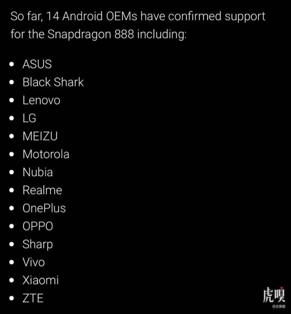 有趣的是,首批名单中也没有三星。首批确认未来会搭载骁龙 888 的终端厂商有 14 家,其中除了 LG 和夏普以外,其余 12 家都是来自中国的厂商(当然不可能有华为,也暂时不会有荣耀),你就应该能明白谁才是高通的大客户,以及骁龙 888 这个名字,是为了谁而起的了。