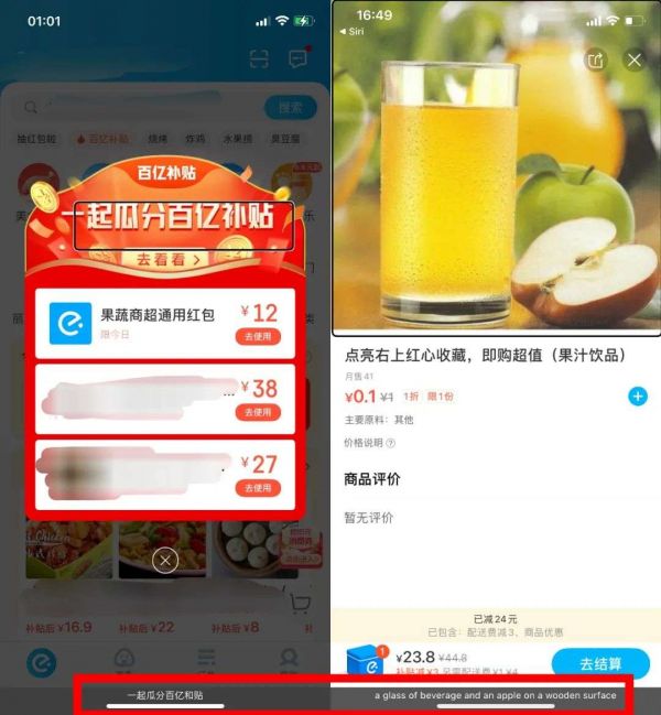 除了平台的优化之外,手机厂商的技术进步也能减轻视障群体的困扰。还是以饿了么红包为例,虽然它做到了对红包细则的具体描述,但红包的顶部描述还没有加入标签识别。而iOS 14的“旁白识别”功能就可以通过OCR进行文字和图像识别来帮助视障群体辨认,虽然有时不太准确,但也很好地弥补了平台这一疏漏。