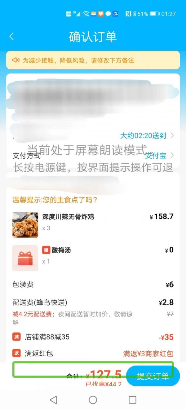 这种流畅的体验也延续到了浏览和点餐功能上,如今,饿了么的添加按钮不仅可以被直接识别,它还能同时念出完整菜品介绍,方便用户确认,视障群体在浏览菜品时就可以听到合适的优惠搭配,在下单过程中,饿了么的红包选项和也可以被自动识别出来转换成语音。