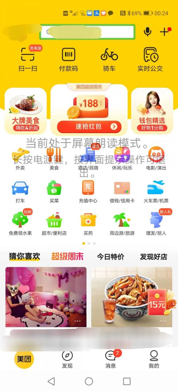 进入到页面之后,饿了么还给了我们另一个惊喜。去年的首页UI较为杂乱,不仅没有搜索栏识别,一个个滑动Banner也构成了巨大的干扰信息。今年的饿了么UI进行了大改,恼人的滑动Banner被移除,变成了简洁易懂、可被系统识别的按钮,而且饿了么也加入了搜索框本身的标签识别,让视障群体可以轻松听到搜索框的位置提示,进行手动输入。