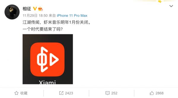 11月29日,微博认证用户(前华纳音乐/环球音乐中国区市场总监)相征发布的一则关于"虾米音乐明年1月份关闭"的微博,而据微博用户@果壳放大灯 则称,虾米音乐有关高管目前在北京开会,回去要执行一些人员变动,虾米音乐很可能将要解散。