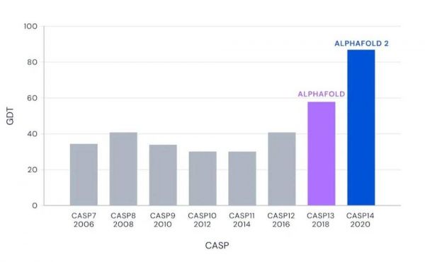 在每次CASP竞赛中,表现最好的团队做出的预测的中值GDT分数。| 图片来源:DeepMind