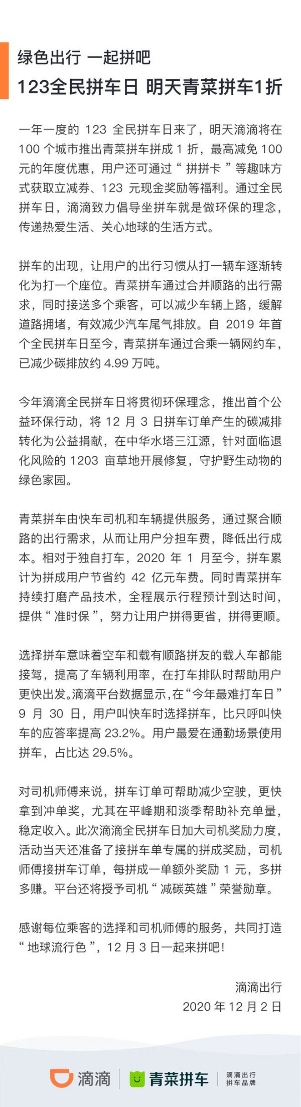 滴滴宣布12月3日100个城市乘客拼车1折