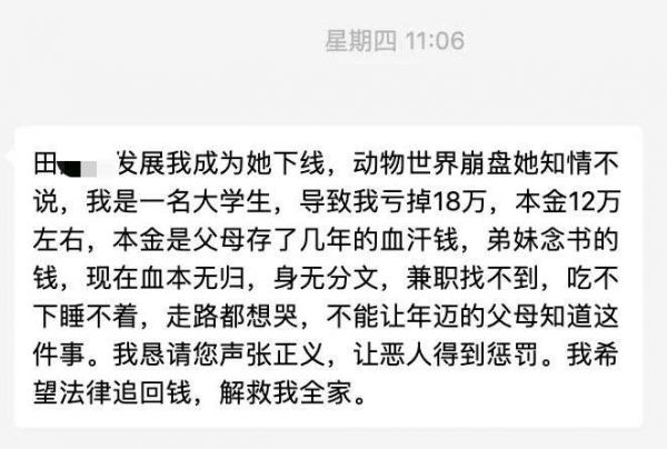 到了11月底,包括钟红、李欣在内的动物世界玩家,看到了盟主李洁在群里的公告称,大家趁年关将至,可以多多投入,能够迎来更大的回报,然而这一纸公告确实晴天霹雳的开始。