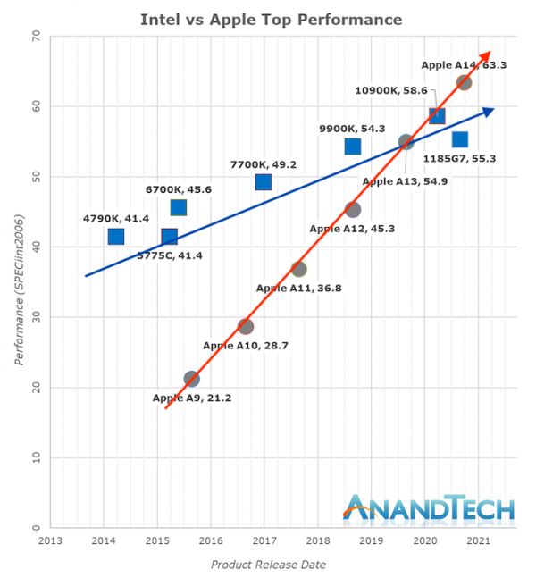 确实如此。下面这张图表引自AnandTech的一篇文章,它向我们展示了过去几年里(2014-2020)苹果自研芯片和英特尔处理器的性能发展情况,苹果A系列芯片的性能表现在2019年超过了英特尔,现在已经处于领先地位。(作者注:线条和箭头是我自己加的)