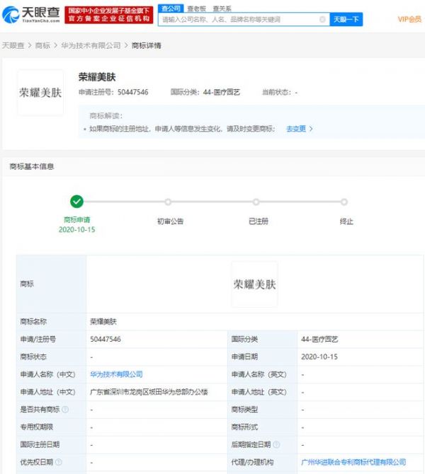 天眼查App显示,近日,华为技术有限公司新增多条商标信息,其中一条商标名称为“荣耀美肤”,申请日期为10月15日,国际分类为医疗园艺,商标状态为“商标申请中”。