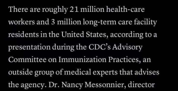 据报道,疾控中心免疫实践咨询委员会一项报告显示,美国约有2100万医护人员和300万长期护理机构入住者。疾控中心国家免疫和呼吸系统疾病部门负责人南希·梅森尼尔说,大多数州和地方司法管辖区预计要花三周的时间,为所有医护人员接种疫苗。辉瑞和Moderna的疫苗约需要接种两次,中间间隔一个月。