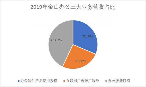 根据金山办公2019年报数据显示,其主要营收来源于三大板块业务,分别是办公软件产品使用授权、办公服务订阅和互联网广告推广三种。而这三大业务在其总营收占比中分别为31.39%、43.02%和25.58%。付费服务已经成为了其主要营收来源,广告业务反而只占据了极小的一部分。