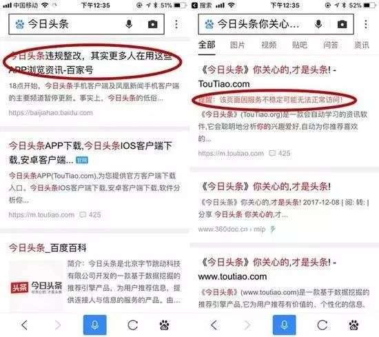 今日头条表示,在百度搜索“今日头条”相关内容,排序第一的搜索结果,是由非正规稿源于2017年12月中旬发布的“旧闻”。排序第二的搜索结果,是“今日头条官网”,却用红字标出警告:“提醒:该页面因服务不稳定可能无法正常访问”。