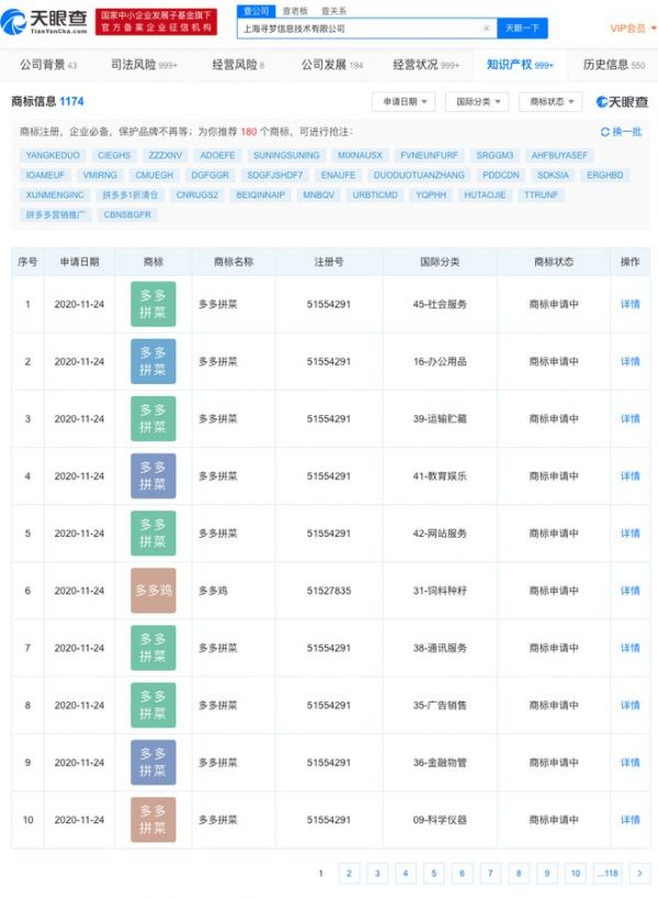 天眼查App显示,近日,上海寻梦信息技术有限公司新增“多多拼菜”“多多鸡”“多多果园”等商标信息。商标涉及的国际分类包含社会服务、办公用品、运输贮藏、教育娱乐等,目前商标状态为“商标申请中”。