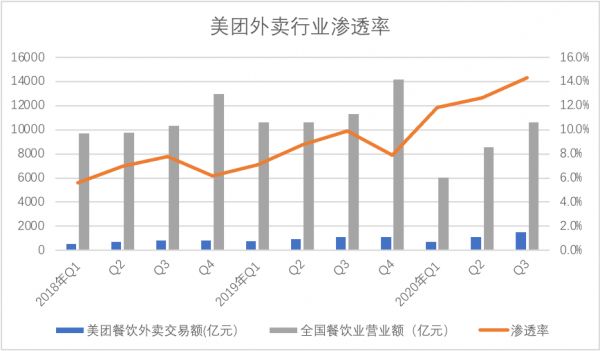 先看第一个问题,受疫情影响,餐饮业损失巨大,根据国家统计局数据,今年1-9月,餐饮业总收入同比下降23.9%,共计25000亿元,在堂食受到严重影响之下,外卖借此迅速提高了渗透率,我们整理了美团外卖多周期以来对餐饮业的渗透率,见下图