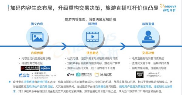 易观分析师认为,包括携程、马蜂窝、穷游等在内的诸多旅游公司,对“内容生态”的探索由来已久,并已经历三个阶段的迭代:从图文到短视频,再到如今的旅游直播,分别代表着三种核心内容价值——内容传播—信息触达—交易决策。细分来看,携程在内容生态领域的布局极具延续性和穿透性,通过自建内容与投资并购的方式,在内容传播、信息触达、交易决策进行了广泛布局。而携程直播目前的业绩表现,正是厚积薄发的结果。