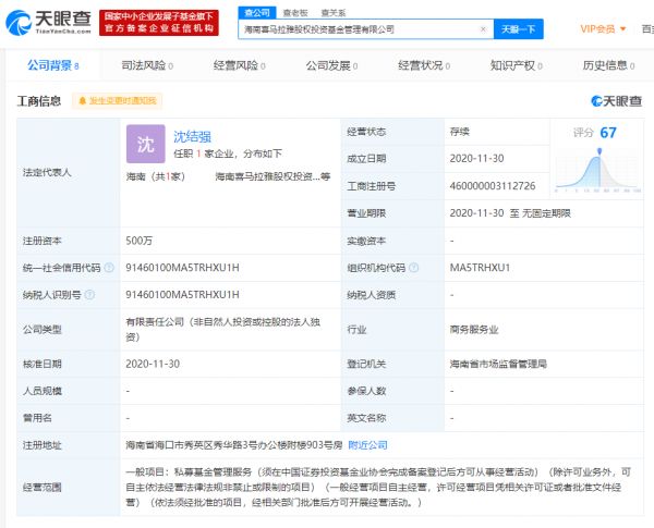 天眼查显示,11月30日,海南喜马拉雅股权投资基金管理有限公司成立,注册资本为500万。该公司经营范围包括私募基金管理服务(须在中国证券投资基金业协会完成备案登记后方可从事经营活动)。股东信息显示,该公司由上海喜马拉雅科技有限公司100%持股。公司法定代表人为喜马拉雅FM副总裁沈结强;穿透股权结构,其实际控制人为喜马拉雅创始人兼联席CEO余建军。