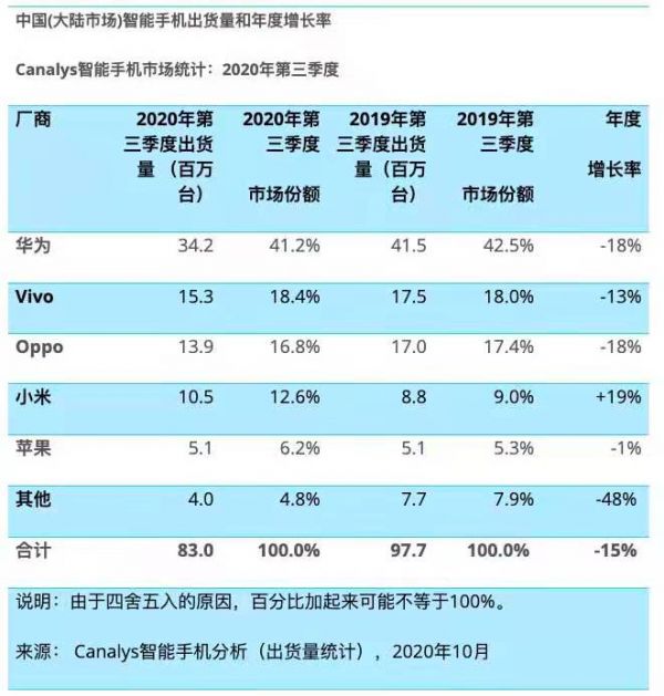 至此,智能机市场格局突变,原本从Canalys发布的数据显示,2020年第三季度华为(包含荣耀)以3400万台出货量位居第一,往后是OV与小米。从当下情况来看,荣耀分拆,各家高端机的延迟发布,第四季度的市场座位次序必定发生很大变化。