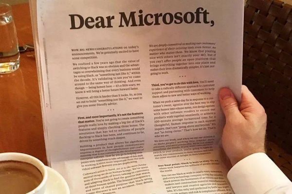 尽管遭遇了行业巨头微软的捆绑狙击,但Slack依然对自己充满信心。在微软发布Teams之后,Slack还在《纽约时报》买下整版广告,布特菲尔德宣布“欢迎微软加入竞争”。但不可否认的是,微软的企业办公软件具有明显的集团优势。在微软的捆绑狙击下,Slack的用户增长也开始放缓,并在去年被微软超过。今年7月,Slack在欧盟投诉微软滥用自己的市场主导优势,将Teams软件与Office办公组建捆绑。