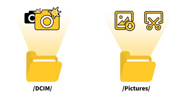 为了把这些区分开来,安卓系统又搞了个名叫 Pictures ( 图片 )的文件夹,用来存相机以外来源的图片。