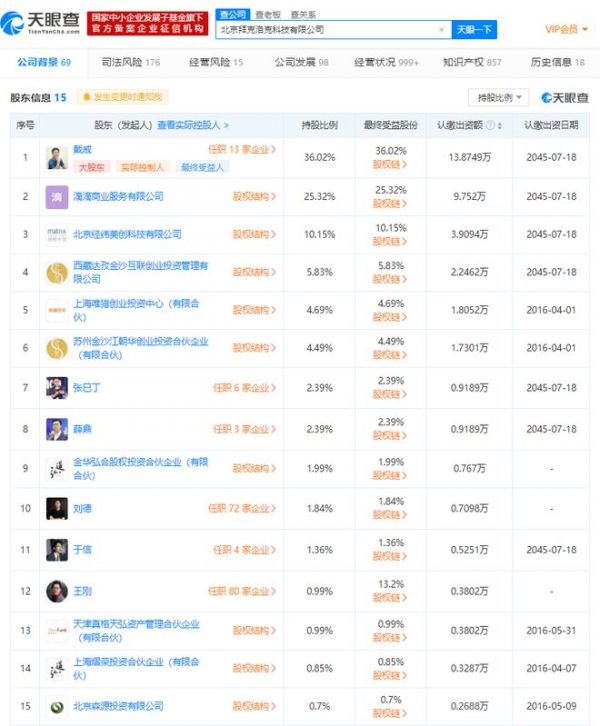 天眼查App显示,北京拜克洛克科技有限公司成立于2015年8月,注册资本约38.52万,公司经营范围包括:技术开发、技术推广、技术转让、技术咨询、技术服务;销售自行开发后的产品;计算机系统服务;基础软件服务等。天眼查App股东信息显示,戴威持股36.02%为该公司最大股东,第二、第三大股东为滴滴商业服务有限公司、北京经纬美创科技有限公司,持股比例分别为25.32%、10.15%。