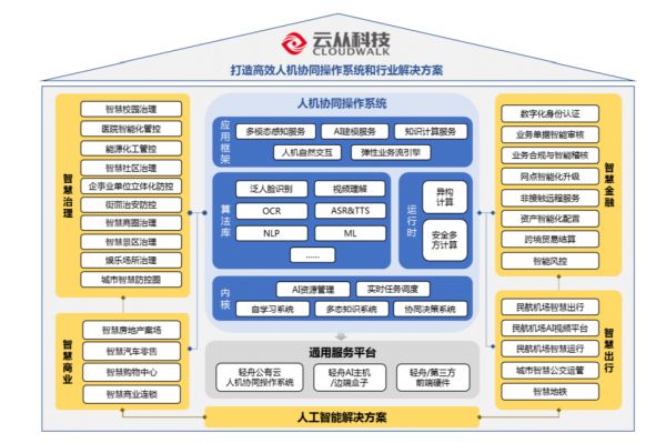 云从科技最早布局的是智慧金融、智慧安防领域,2017年下半年开始进入智慧商业板块。创始人给出的规划路线是,人脸识别最先落地;打造跨视觉、语音、数据技术的AI技术闭环,赋能金融、公安和出行、商业四个行业;通过人机协同操作系统建立各个行业大脑,赋能百业。
