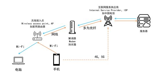 在日常生活中,当我们通过无线方式在不同设备间传输文件时,可能较多使用微信,QQ,电子邮件等方式。这种情况下,数据包会从设备通过电磁波信号发向路由器,再由网线传输到光猫,之后就通过光纤传入运营商,到达相应服务器后,再将数据包原路返回,传输给另一个设备。