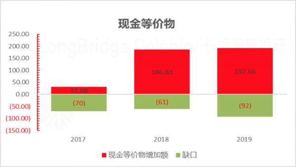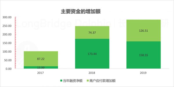 在实际考虑中,以 2019 年为例,海豚剔除掉商户应付款增加为拼多多贡献的 126 亿现金,当年现金等价物 + 短期投资增加的 192 亿中真正增加的只有 66 亿元,而当年实际融资净额就有 158 亿,由于拼多多长期投入很少,中间 92 亿的缺口应该就是运营资金缺口了。