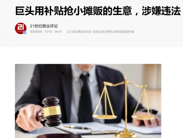 中国的互联网巨头逐鹿社区团购是近期的一则热闻。美团、滴滴、拼多多、阿里、京东等等纷纷撸起袖子,做起卖菜生意,“夺走卖菜商贩生计”的争议因此甚嚣尘上,进而引发法律学者“巨头用补贴抢小摊贩的生意,涉嫌违法”的质疑。