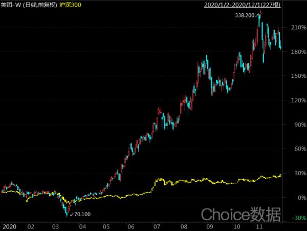 截至12月3日,美团股价年内涨幅为170%,市值增长了一万亿,在所有已上市中国互联网公司中跻身前三。