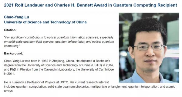 今年10月,美国物理学会(APS)宣布将2021年度罗夫·兰道尔和查尔斯·本内特量子计算奖(2021 Rolf Landauer and Charles H. Bennett Award in Quantum Computing)颁给中国科学家陆朝阳,奖励其「对光量子信息科学,尤其是固态量子光源、量子隐形传态和光量子计算的突出贡献」。