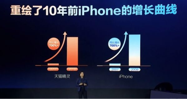 在天猫精灵2019春季新品发布会上,天猫精灵公布了一组数据:截至2019年1月11日,天猫精灵累计销量突破1000万台,相比于2017年同比增长700%,重绘了10年前iPhone的增长奇迹。