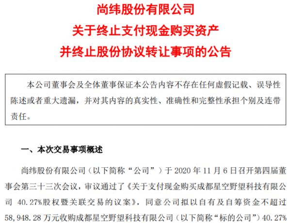 投资界消息,12月3日晚间,尚纬股份突发公告称,终止支付现金购买成都星空野望科技有限公司40.27%股权的交易。根据原先的公告,这一笔交易金额高达5.89亿元。