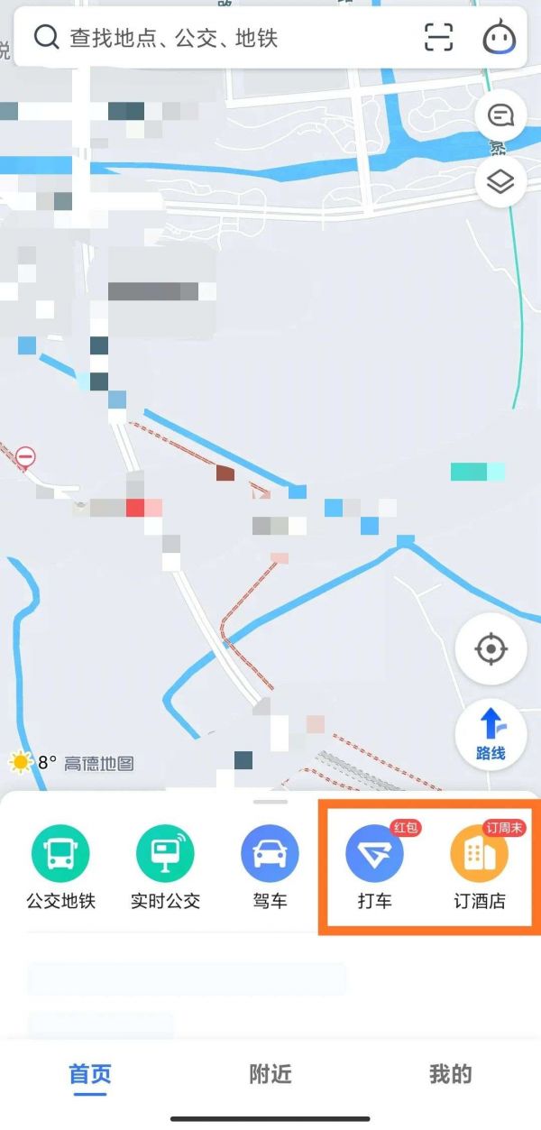 打开高德地图,首先映入眼帘的就是地图导航软件标配的页面——一张标注了使用者实时位置的二维地图和目的地搜索栏。