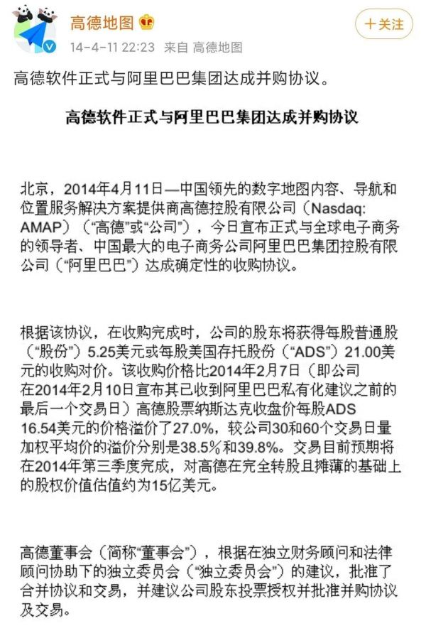 高德宣布与阿里巴巴集团达成并购协议,图源高德地图官微