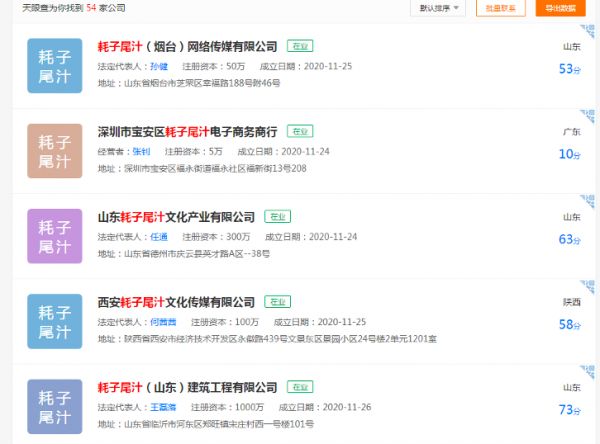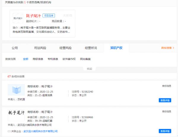 传武骗子马保国被B站鬼畜区鬼畜之后开始了全网走红之路,“耗子尾汁”“松果弹抖闪电鞭”“大意了,没有闪”等词也随之爆火。随后网上爆出消息,“耗子尾汁”被海南一家公司注册为公司名,去天眼查APP上搜索“耗子尾汁”,有能找到54家公司,67条商标信息。或许是“耗子尾汁”在大众之间的影响力过大,天眼查也将“耗子尾汁”划为一个品牌。