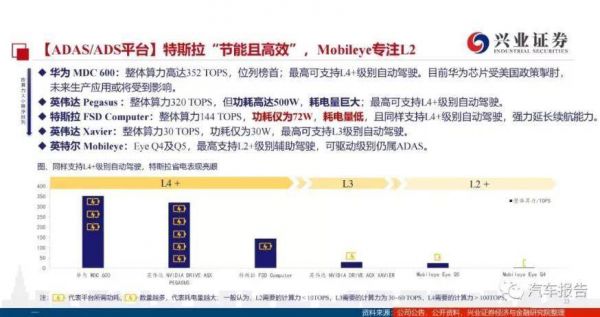 在兴业证券出示的一份《自动驾驶专题研究报告》中,华为智能驾驶芯片MDC 600整体算力排在行业第一,超越了英伟达Xavier、英特尔Mobileye等,国内的小鹏、理想和蔚来用的分别就是英伟达芯片和英特尔芯片。