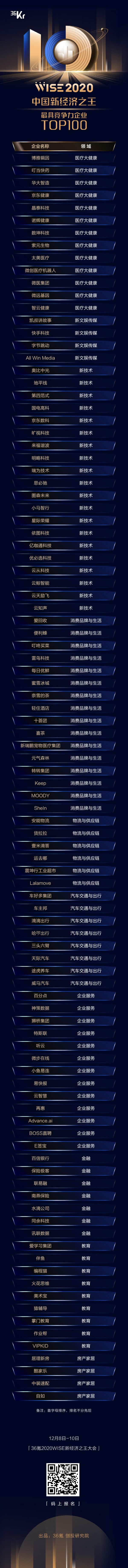 基于此,36氪创投研究院在今年10月启动了2020年中国新经济之王年度公司评选,针对新经济十大领域:医疗大健康、消费品牌与生活、新文娱传媒、企业服务、新技术、汽车交通与出行、智慧物流与供应链、教育、金融、房产家居,设置了「2020年中国新经济之王最具竞争力企业」和「2020年中国新经济之王最具影响力企业」两大奖项,最终共有500余家新经济公司入选。