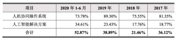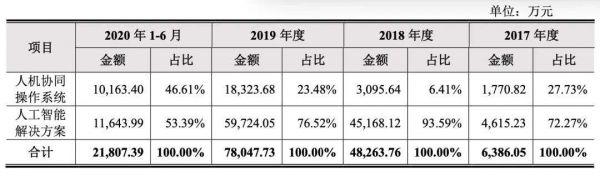 其中,人机协同操作系统收入占比逐年升高,在2020上半年,已占据主营业务收入的46.6%,逼近云从人工智能解决方案的收入。
