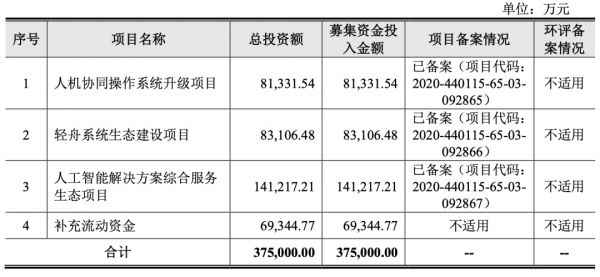 招股书显示,此次募集资金所得净额将全部围绕其人工智能技术的研发展开,以持续提升人工智能方面的技术实力及产品能力。具体包括人机协同操作系统升级项目、轻舟系统生态建设项目、人工智能解决方案综合服务生态项目及补充流动资金。