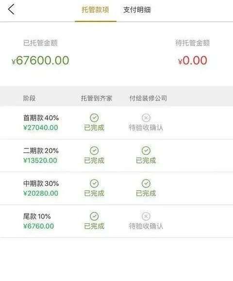 前者表示,签约后用户的资金会托管在土巴兔平台上,每一阶段的装修工作得到用户认可之后平台才会放款给装修公司;后者则称,有包含资金托管、与第三方监理帮忙做施工质量把关、赠送132万平安装修综合险三重保障的齐家保为用户提供保障。