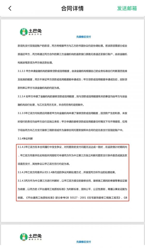 而土巴兔的第三方合同,则清晰列明,甲乙双方均授权由平台判断是否应该付装修款,如果平台判断该付,那么就可以直接付款。